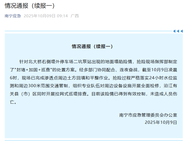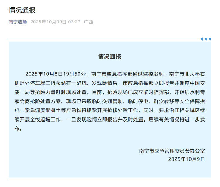 2025年10月8日19时50分,南宁市应急指挥部通过监控发现:南宁市北大桥右侧堤外停车场二坑泵站有一陷坑。发现险情后,市应急指挥部立即报告并调度中国安能一局等抢险力量赶赴现场处置。目前,抢险现场已成立临时指挥部,并组织水利专家会商抢险处置方案。现场已采取临时交通管制、临时停电、群众转移等安全保障措施速速查,紧急调度混凝土等应急物资抓紧开展抢修处置工作。同时,要求沿江相关城区继续开展全线巡堤工作,一旦发现险情立即报告并及时处置。后续有关情况将进一步发布。