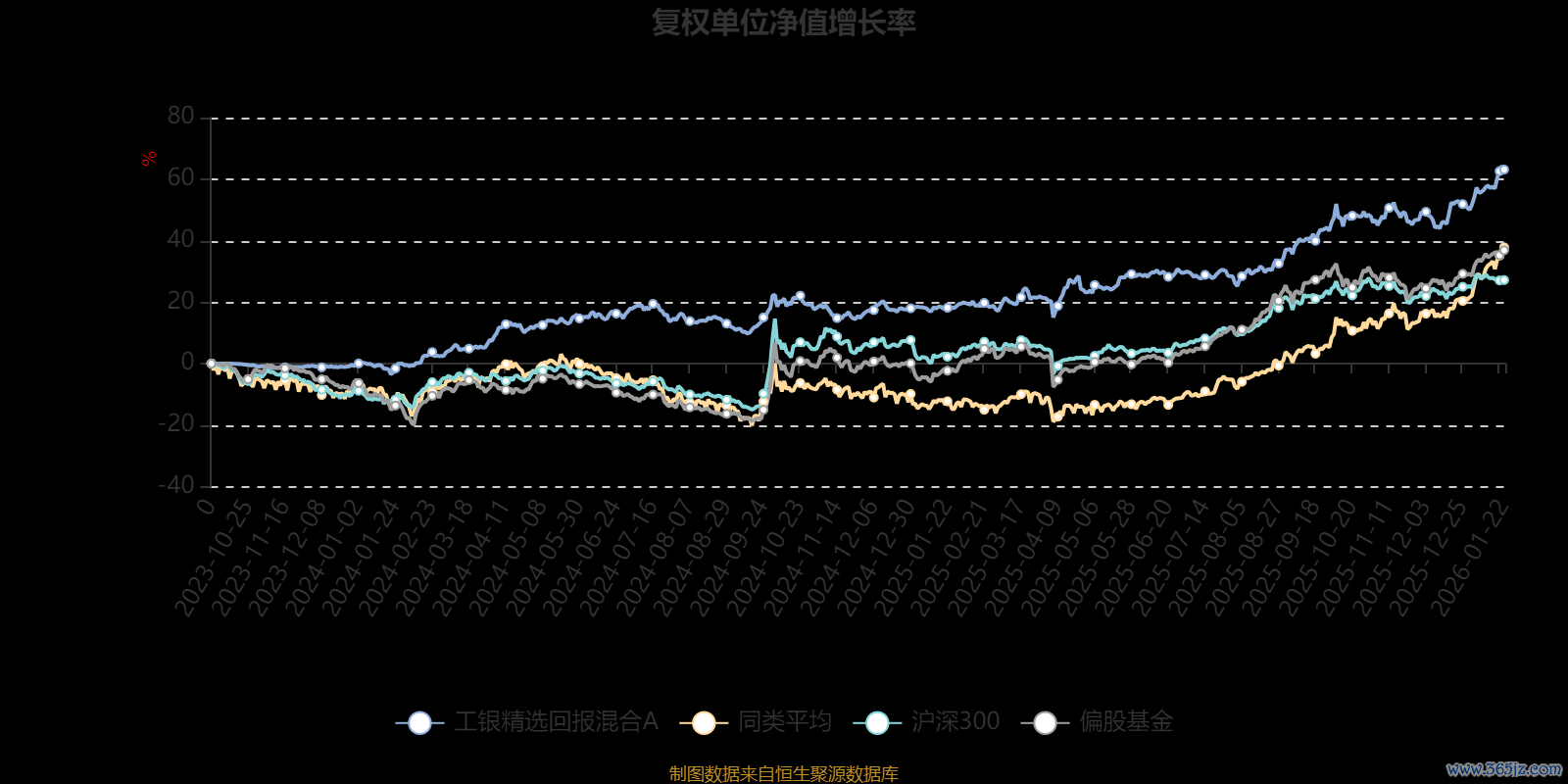 截至1月22日,工银精选回报混合A近三个月复权单位净值增长率为10.06%,位于同类可比基金39/49;近半年复权单位净值增长率为25.64%,位于同类可比基金35/49;近一年复权单位净值增长率为38.05%,位于同类可比基金31/46。