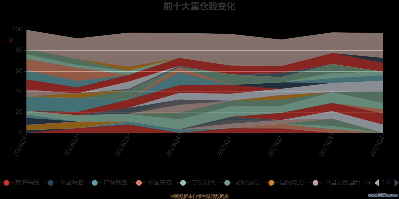 该基金持股集中度较高,近2年前十大重仓股集中度长期超过60%。截至2025年四季度末,基金十大重仓股分别是中国南方航空股份、中国东方航空股份、中国国航、招金矿业、紫金矿业、山东黄金、长江电力、中国电信、南方传媒、分众传媒。